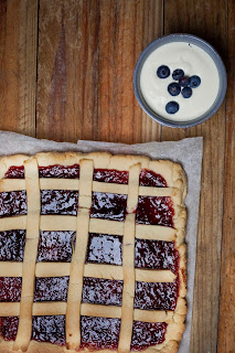 7. With the extra dough, roll out flat (about 1cm thick) and cut strips. Place the strips, one at a time, to create a lattice work effect on top of the crostata.