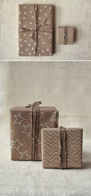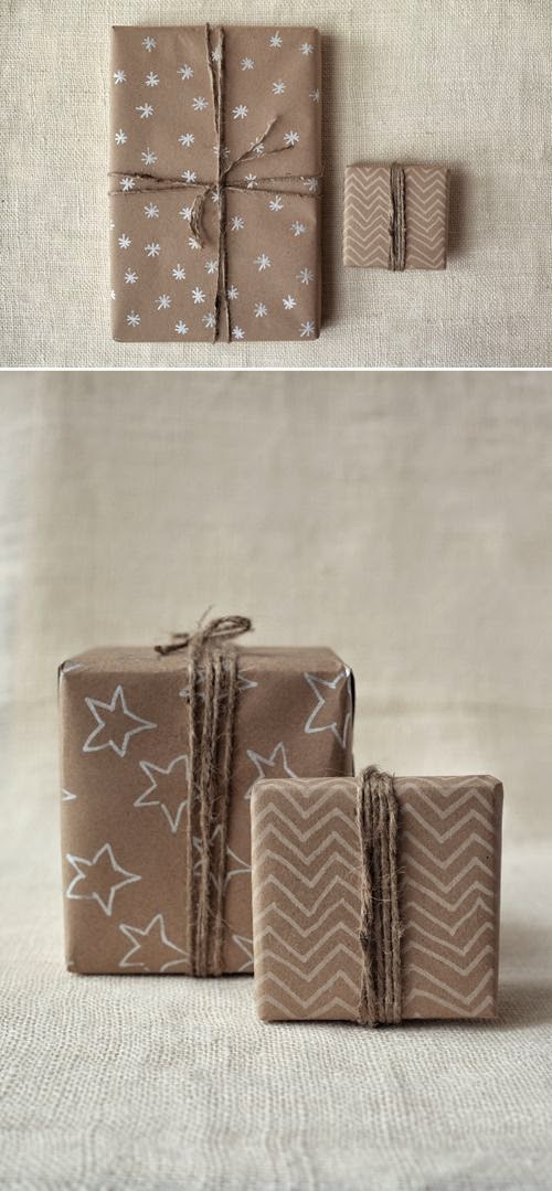 White or metallic pens on brown kraft paper gives it a fresh feel. Play around with simple design motifs such as stars, hearts, balloons. Image from www.witandwhistle.com