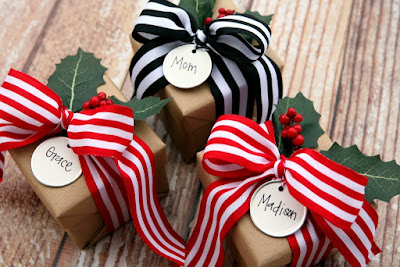 - Use whatever wrapping paper you like (plain kraft paper has a premium, organic look) and dress it up with these show-stopping striped ribbons.