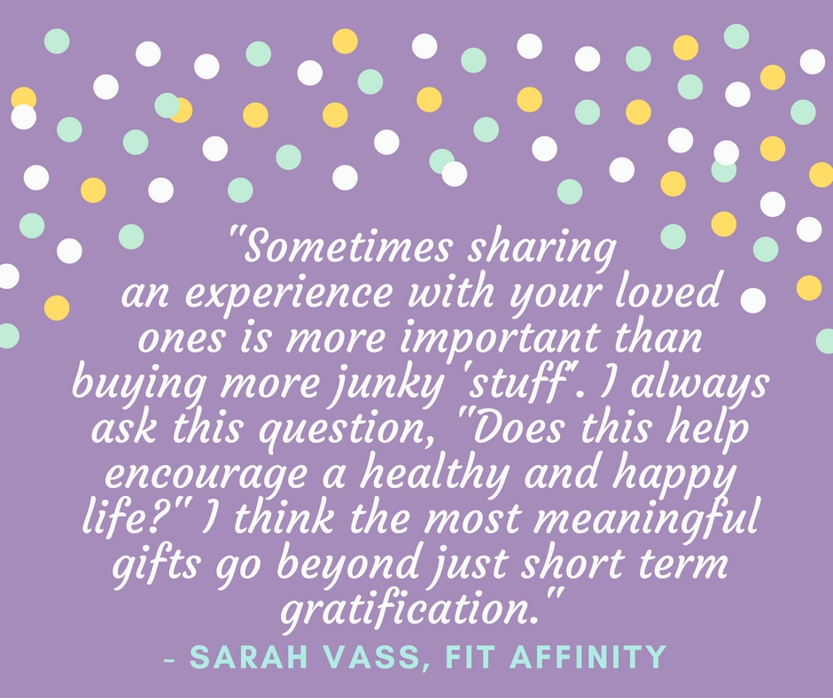 “Sometimes sharing an experience with your loved ones is more important than buying more junky ‘stuff’. I always ask this question, “Does this help encourage a healthy and happy life?” I think the most meaningful gifts go beyond just short term gratification.”