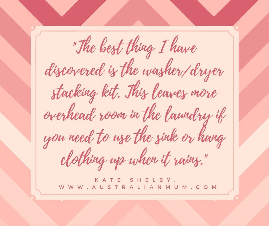 Kate says, “The best thing I have discovered is the washer/dryer stacking kit. This leaves more overhead room in the laundry if you need to use the sink or hang clothing up when it rains.” Here’s an example of the stacking kit.