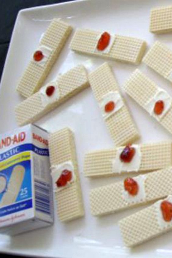 Looking for an easy Halloween party food idea? These biscuits are are realistic enough to be pretty gross! Just grab some waffers, white icing and strawberry or raspberry jam. And don’t forget to display with the Band-Aid box! The kids will love these!
